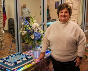 Lisa Langford poses with the cake at her retirement party. She retired on Friday after more than 16 years with TSTC. (Photo by Tony Pilkington/Breckenridge Texan)