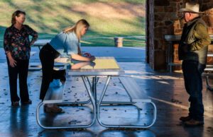 Elizabeth Everett, center, writes the donation amount on the oversized check for last week’s presentation to the local volunteer fire departments, while her parents, Teresa and Jim Everett, look on. See more photos from the check presentation in the photo gallery. (Photo by Tony Pilkington/Breckenridge Texan)