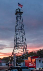 Cody Wimberley and Josh Patterson install a new flag atop Tommy Wimberley’s vintage oil derrick on Friday, Dec. 5. Tommy originally installed the derrick in downtown Breckenridge; in 2015 it was moved to the Buffalo RV Park, and in 2021 it was moved to its current location. (Photo by Tony Pilkington/Breckenridge Texan)
