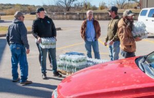 Breckenridge Mayor Bob Sims, left, talks to volunteers who were helping load cases of water into cars for local residents at One Church this afternoon. (Photo by Tony Pilkington/Breckenridge Texan)