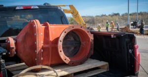 This valve was picked up in Lubbock this morning and transported to Breckenridge to replace the broken valve that has prevented the City of Breckenridge’s water towers from filling up since Tuesday morning. The initial issue was caused by a water line that was busted by a contractor installing fiber optic lines in downtown. (Photo by Tony Pilkington/Breckenridge Texan)