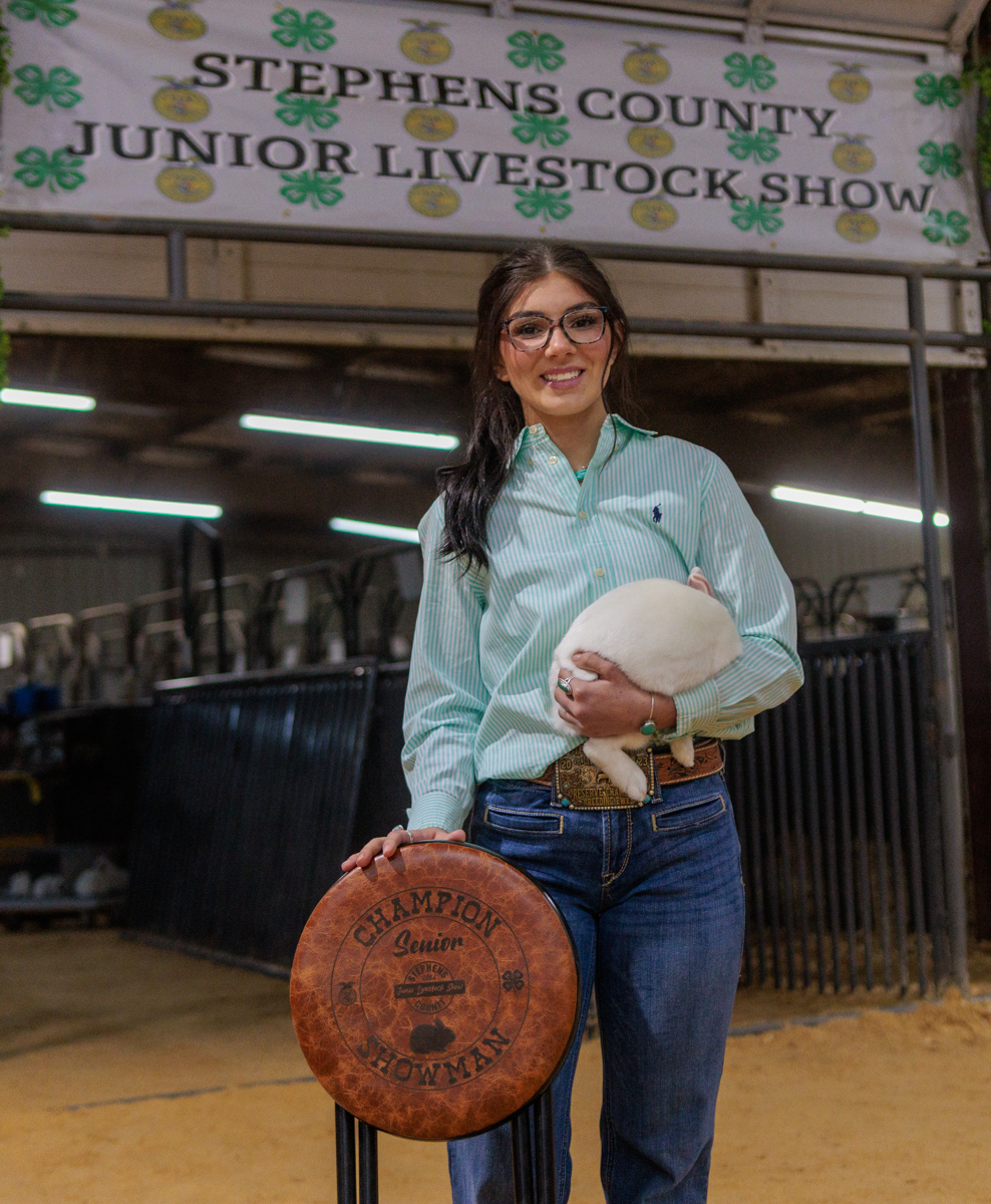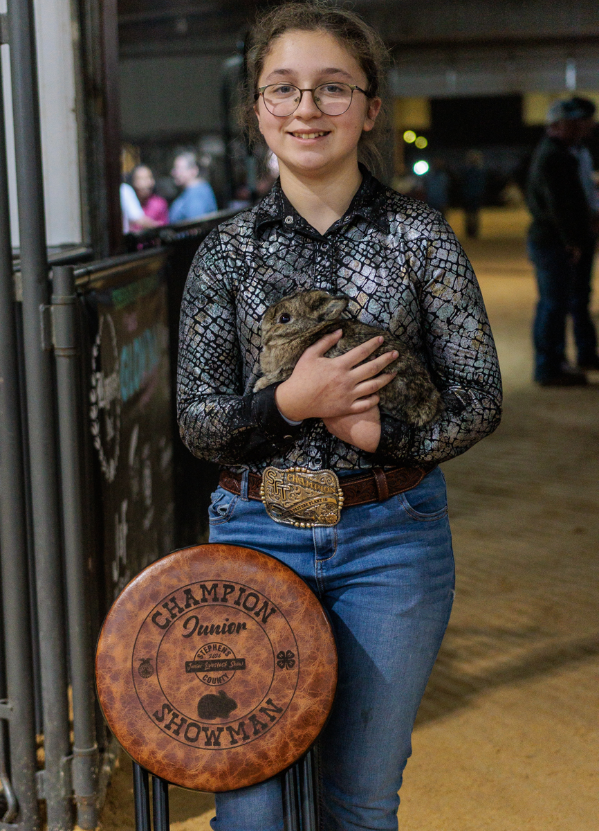 Collom Perkins won the Senior Showmanship competition in the Rabbit Division, as well as showed the grand champion doe. She will compete in the Jacob Jackson Master Showman contest on Saturday. (Photo by Tony Pilkington/Breckenridge Texan)
