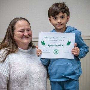 Second-grade student Ryver Martinez was honored as the Student of the Month at the Jan. 19 BISD school board meeting by East Elementary Principal Shannon Deen. (Photo by Tony Pilkington/Breckenridge Texan)