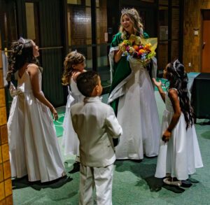 Newly crowned Buckaroo Queen Lane Bartoskewitz laughs with the trainbearers, flowerbearer and crownbearer after the ceremony Saturday night. (Photo by Tony Pilkington/Breckenridge Texan)