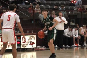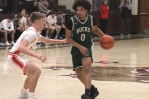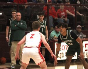 White answered a Holliday basket with another jumper to make it 17-17, and Conor Salazar drove it in for a layup to put the Bucks ahead 19-17. The two teams continued to trade blows in what turned into a heavyweight fight – a preview of what is to come in the 2026-2028 district alignment.