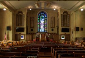 The First Christian Church sanctuary features a stained glass window made by the Kansas City Stained Glass Works. (Photo by Tony Pilkington/Breckenridge Texan)