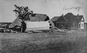 After first meeting in members’ homes and then in a school building, First Christian Church of Breckenridge built a white, clapboard church, pictured here after it was destroyed by a cyclone. (Photo courtesy of First Christian Church)