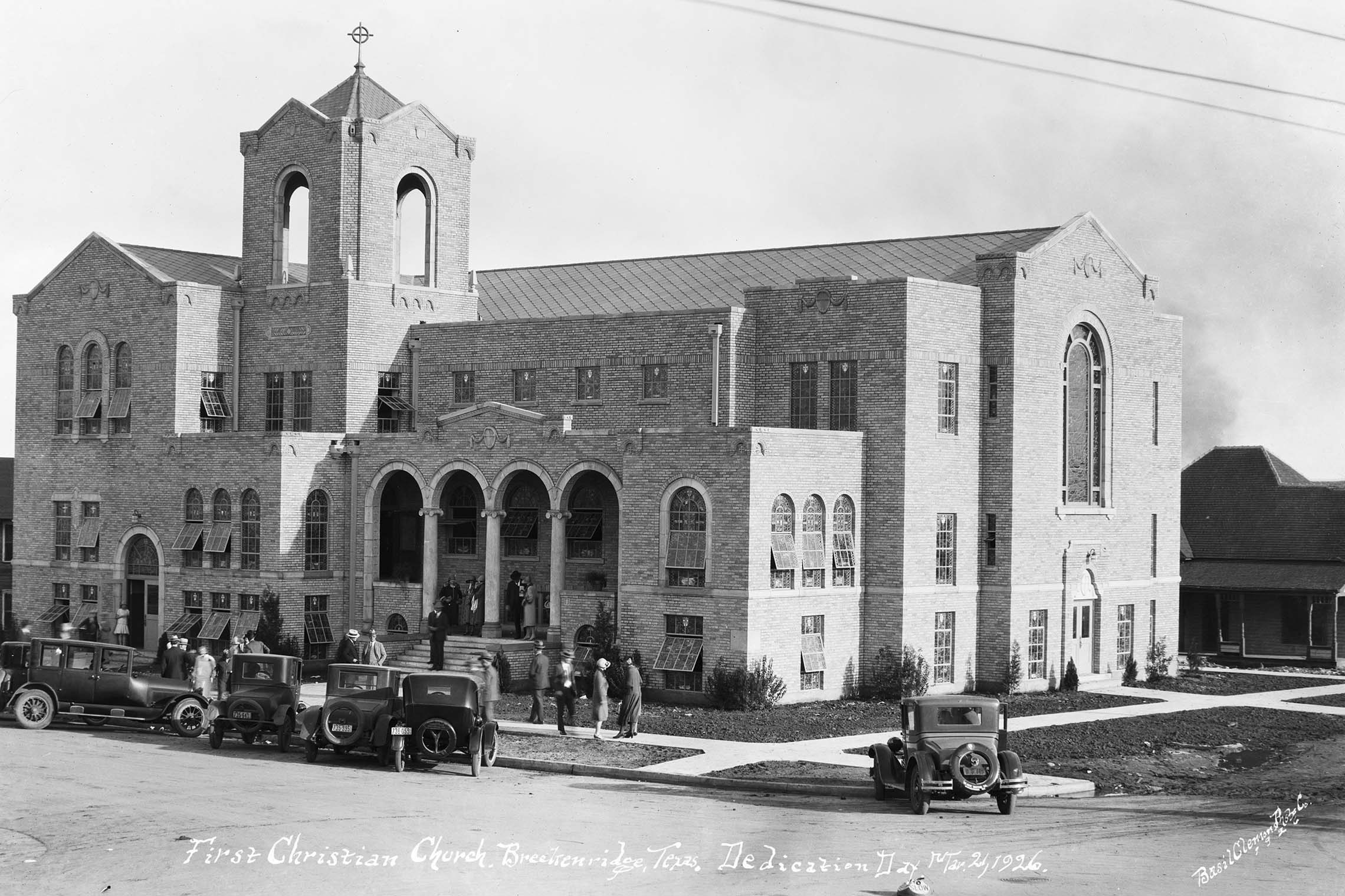 First Christian Church of Breckenridge held a dedication service for the new building on March 21, 1926, as seen here in this Basil Clemons photograph. (From the Basil Clemons Photograph Collection, University of Texas at Arlington Libraries, UTA Libraries Digital Gallery, https://library.uta.edu/digitalgallery/img/20070047)