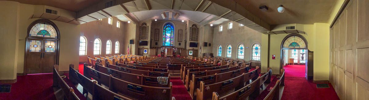 A panoramic view of the First Christian Church’s sanctuary shows the many original features of the 100-year-old building, including the stained glass windows and stenciled walls and ceiling. (Photo by Tony Pilkington/Breckenridge Texan)