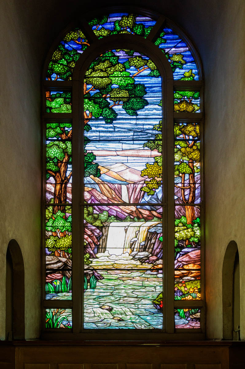 The First Christian Church sanctuary features a stained glass window made by the Kansas City Stained Glass Works. (Photo by Tony Pilkington/Breckenridge Texan)