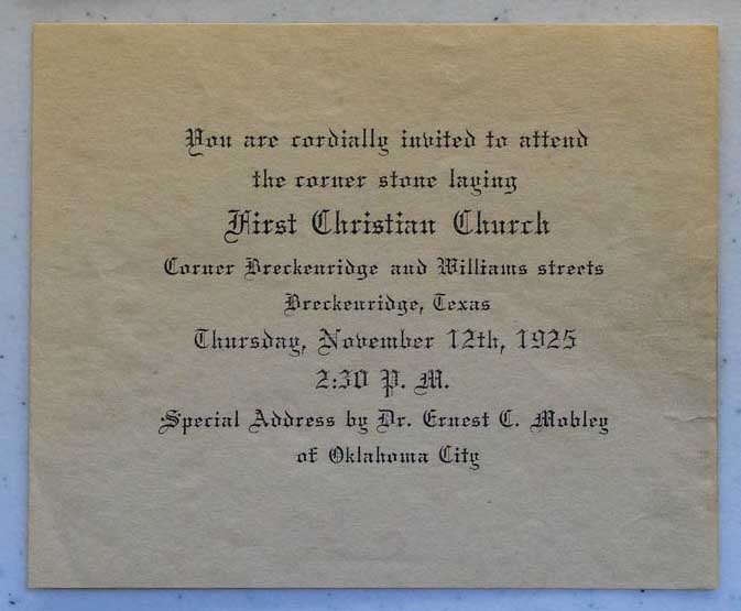 This invitation to the cornerstone laying was sent to Mr. and Mrs. O.R. Hay of Breckenridge in 1925.