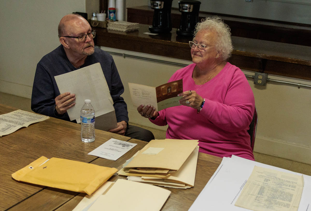 Virgil and Elaine Moore, who were married in the First Christian Church almost 54 years ago, look through some of the historical documents about the church. The late Betty Fambro saved hundreds of church documents and photos, providing a rich history of the Breckenridge church. (Photo by Tony Pilkington/Breckenridge Texan)