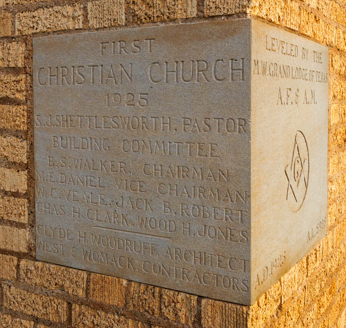 The First Christian Church cornerstone is located on the northwest corner of the building and contains a variety of historical church and community documents. (Photo by Tony Pilkington/Breckenridge Texan)