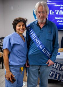 Wearing a sash proclaiming “The Legend Has Retired,” Dr. Prater was presented with a plaque by Dr. Kelli Windsor, the hospital’s chief of staff.
