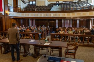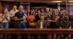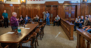 The crowd in the district courtroom last week gave outgoing county judge Michael Roach (seated, center) a standing ovation in appreciation for the work he’s done for the county. (Photo by Tony Pilkington/Breckenridge Texan)