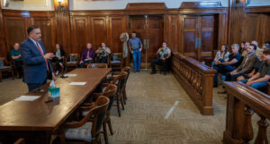 District Court Judge Phillip Gregory talks about how he and Stephens County Judge Michael Roach, seated at right, have often consulted with each other during the past several years. (Photo by Tony Pilkington/Breckenridge Texan)