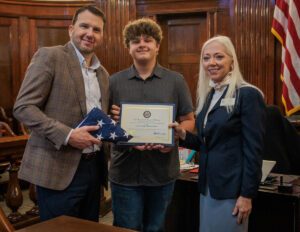 Melanie Berry with Rep. Roger Williams’ office also attended the event and presented Stephens County Judge Michael Roach with a flag and certificate from the U.S. congressman in appreciation for his service to the county and state. Also pictured is the judge’s son, Levi Roach. (Photo by Tony Pilkington/Breckenridge Texan)