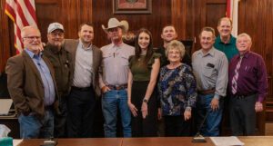 Friends and co-workers posed for a picture with Stephens County Judge Michael Roach during an appreciation event on April 2. Roach is resigning from the county judge position to pursue a law career. Pictured, from left, are incoming county judge Will Thompson, County Commissioner Mark McCullough, Michael Roach, County Commissioner Will Warren, Commissioners Court Administrator Cecelia Gonzales, County Commissioner Tanner Wade (back row), County Clerk Jackie Ensey (front row), County Commissioner David Fambro, Justice of the Peace Steve Spoon, and County Attorney Gary Trammel. (Photo by Tony Pilkington/Breckenridge Texan)