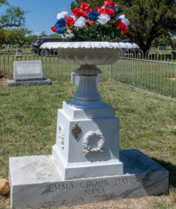 Emma died in Fort Worth on May 23, 1973. She was survived by her daughter, four grandchildren and six great-grandchildren. She is buried in the Albany cemetery and was honored with a DAR memorial medallion on April 8.