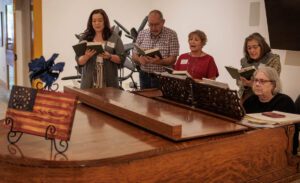 The Viertel family sang patriotic songs at the 100th anniversary celebration of the Lee’s Legion Chapter of the Daughters of the American Revolution. Pictured, from left, are Rachel Viertel, John Viertel, Ladonna Viertel, Melinda Viertel Lucas and Sandy Abel. (Photo by Tony Pilkington/Breckenridge Texan)