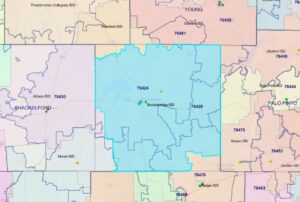 Stephens County has six school districts – Breckenridge, Moran, Woodson, Albany, Ranger and Graham. The Breckenridge ISD is the predominant school district in the county, and everyone who lives within the city limits of Breckenridge is in the Breckenridge ISD and can vote in that school board election. However, some county residents who live on the outer edges of the county may be in other school districts. For example, in the northwest corner of the county, residents might live, pay taxes in and vote in the Woodson ISD. The southwest corner of Stephens County is in Moran ISD, and the southeast corner is in Moran ISD. One spot on the western county line, just west of Eolian, is in the Albany ISD, and a small area southwest of Eliasville is in the Graham ISD. See the map below that shows the geographic boundaries for the school districts in Stephens County.