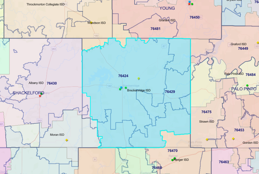 This map from the Texas Education Agency’s school district locator shows the geographic boundaries of Breckenridge ISD, shaded in bright blue. Those who live in Stephens County but not in the blue area will not be eligible to vote in BISD’s election. (Click to enlarge)