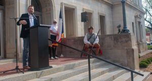 Stephens County Judge Michael Roach spoke briefly about the history of the courthouse, which was built in downtown Breckenridge 100 years ago. (Photo by Carla McKeown/Breckenridge Texan)