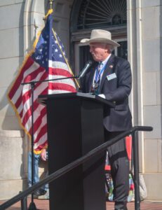 Ken Raney, Stephens County co-chair of the Alamo Letter Society, welcomes guests to the unveiling of the Alamo Letter monument on the lawn of the courthouse. (Photo by Carla McKeown/Breckenridge Texan)