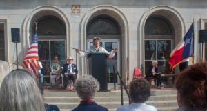 “Today, we celebrate the 100th anniversary of our beloved courthouse and the dedication of a monument to the most important letter in Texas history, William Barret Travis’ February 24, 1836, letter from the Alamo,” Ken Raney said, welcoming guests to the event.