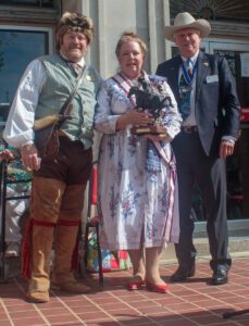Errol Flannery, dressed as his fourth-great-grandfather, Davy Crockett, presents the Captain Albert Martin Alamo Award to Carolyn and Ken Raney, Stephens County co-chairs of the Alamo Letter Society. (Photo by Carla McKeown/Breckenridge Texan)