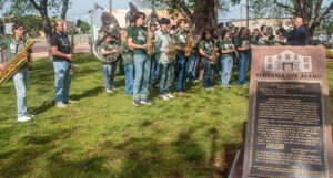 Following the unveiling of the Alamo Letter monument on the Stephens County Courthouse lawn, the Breckenridge High School band played a special arrangement of “Texas, Our Texas.” (Photo by Carla McKeown/Breckenridge Texan)