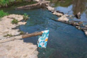 Cutline, top photo: Hygiene packaging and other sewage-related trash and solid waste items were visible in the Gunsolus Creek on Saturday evening, April 25, at a spot where the City of Breckenridge normally discharges treated wastewater. A problem at the wastewater treatment plant led to partially treated wastewater being discharged into the creek. (Photo by Tony Pilkington/Breckenridge Texan)