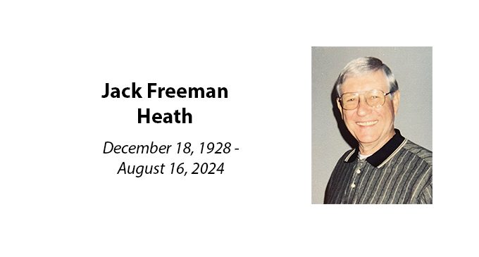 Jack Freeman Heath, 95, passed away on Friday, August 16, 2024, in Brownwood, Texas. He was born December 18, 1928, in Caddo, Stephens County, Texas, to William H. and Etta L. (Riddle) Heath. Jack graduated from Breckinridge High School in 1947 and then attended John Tarleton College. He began his