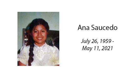 Ana Maria Saucedo Alvarado, age 61, of Breckenridge, passed away Tuesday, May 11, 2021. Funeral liturgy will be held at 10 a.m. Tuesday, May 18, at Sacred Heart Catholic Church with Deacon Rudy Calsoncin officiating. Interment will follow in the Breckenridge Cemetery under the direction of Morehart Mortuary. Rosary will