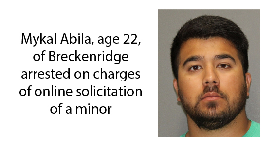 Jon Mykal Abila, age 22, of Breckenridge was arrested on a warrant and charged with Online Solicitation of a Minor at 8:24 a.m. on Friday, May 22, according to a